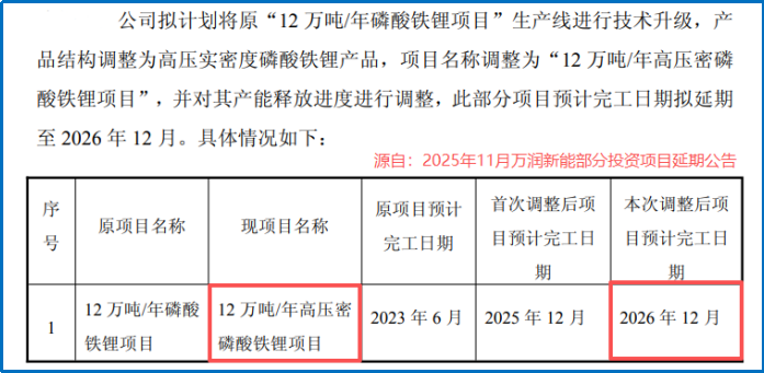 据悉,万润新能2025年11月才启动产能升级,将山东鲁北基地原有12万吨/年磷酸铁锂生产线,改造为高压密磷酸铁锂产能,但该项目完工日期已延期至2026年12月。
