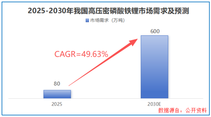 也正因如此,宁德时代神行系列、比亚迪刀片电池等明星产品,均将其列为核心材料。数据显示,2025年我国高压密磷酸铁锂需求量约为80万吨,到2030年或将突破600万吨。
