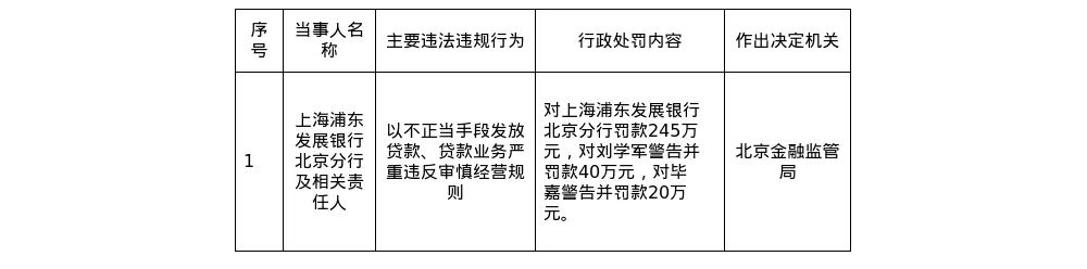 2025年7月18日,国家金融监管总局北京监管局披露,浦发银行北京分行被处罚款245万元。两名责任人被警告,并分别被处以40万元、20万元的罚款。理由是“因以不正当手段发放贷款、贷款业务严重违反审慎经营规则”。
